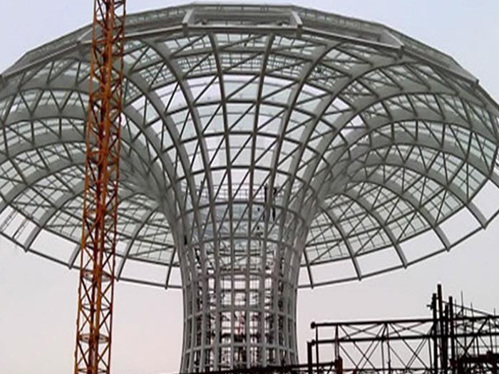 二、球形网架结构因其结构新颖,受力合理,自重轻、用钢量低等优点。如大型体育场馆球形雄安新区螺栓球网架、公共场馆球形网架、电厂雄安新区螺栓球网架、水泥工业球形网架、仓储物流球形网架、雄安新区干煤棚工业球形网架、雄安新区收费站雄安新区加油站球形网架、展览中心、影剧院、商场、航站楼、候车厅、工厂雄安新区车间、仓库、电视塔等球形螺栓球节点网架。国内球形网架结构主要分为:雄安新区焊接球节点网架及螺栓球节点网架两种。螺栓球节点网架其构件工厂内加工量较大,现场安装便捷,适用于现场工期紧,雄安新区施工条件、用电量受制约,网架形状复杂、雄安新区杆件定位困难的异形结构。螺栓球节点球形网架系统基本由雄安新区杆件、螺栓球、支撑支座等组成。按照节点形式可分为交叉雄安新区桁架体系、四角锥体系、三角锥体系等。支撑方式多为固定支座支撑。对于大面积、大跨度及有特殊受力或伸缩要求的网架结构可采用橡胶支座、滑移支座、球铰支座等支撑形式,以满足结构自身的受力稳定、均衡,便于内力释放等设计要求。